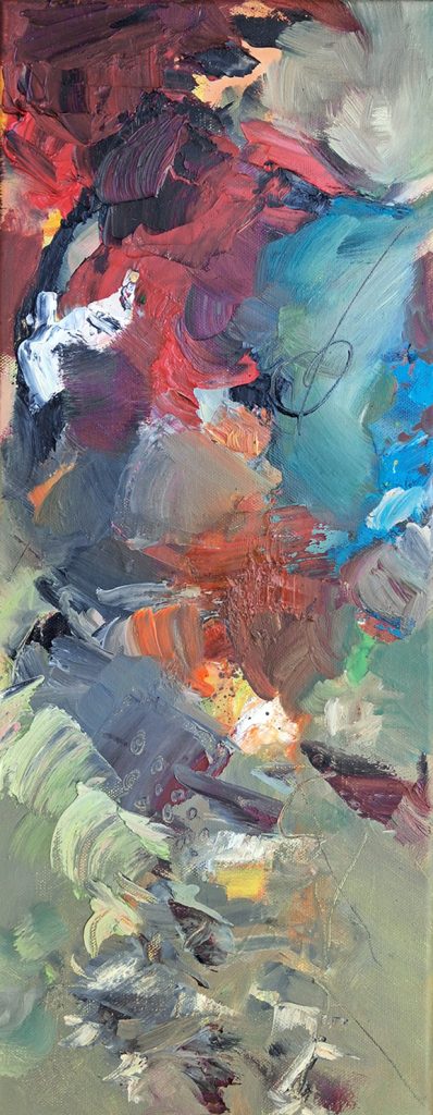 ‘Ik schilder heel intuïtief, wat meestal leidt tot vloeiende lijnen en organische vormen. De laatste tijd duiken echter steeds vaker geometrische figuren op, en – tot mijn eigen verbazing – ook meer figuratieve elementen. Ik ben benieuwd waar dat naartoe leidt,’ aldus Van Lanen.